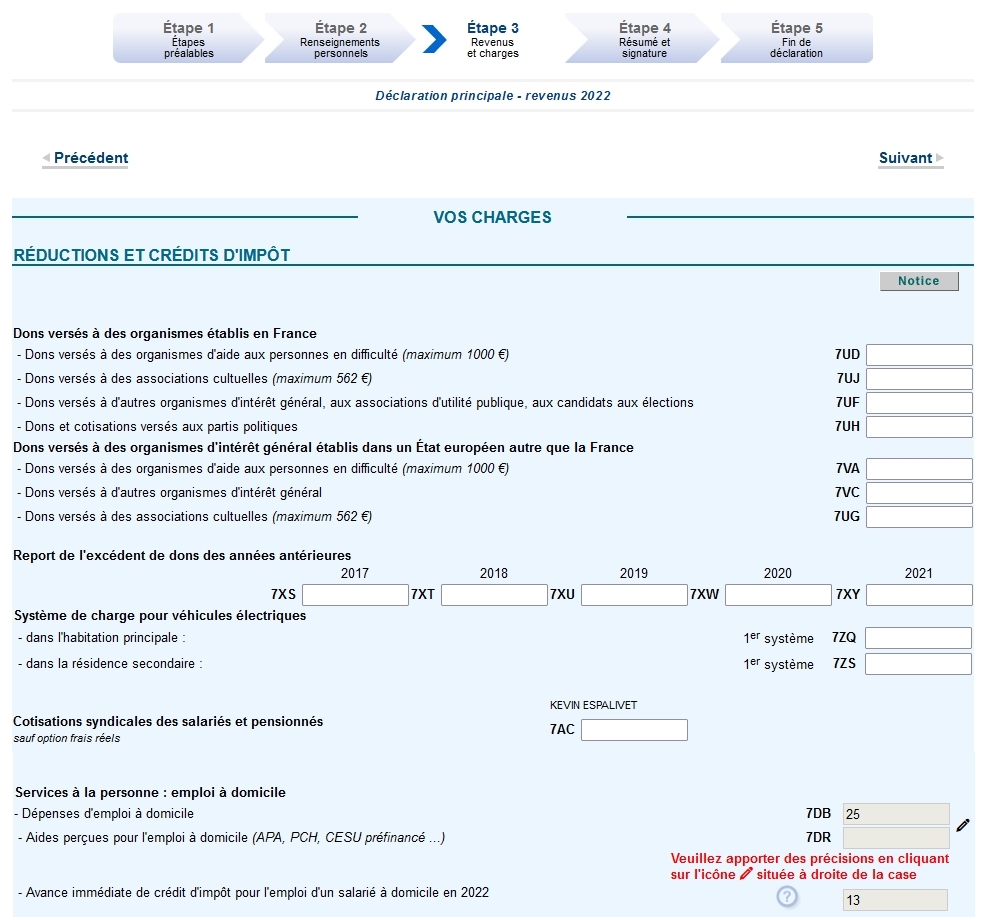 Des les cases préemplies 7DB et 7DR, vous pouvez retrouver le montant des prestations déclarées grâce à l'Avance immédiate. Si durant l'année fiscale passée, vous avez aussi fait appel à des prestations de Service à la Personne avec le crédit d'impôt "classique", vous pouvez les rajouter grâce à l'icône de stylo, à droite de la cellule. Il peut aussi vous être nécessaire de fournir des informations complémentaires sur les prestations, comme ici indiqué en rouge.